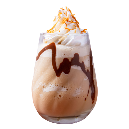 Refrescante mezcla de café frío, leche de coco y hielo, coronada con coco tostado.